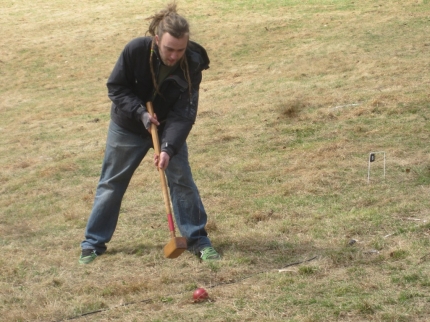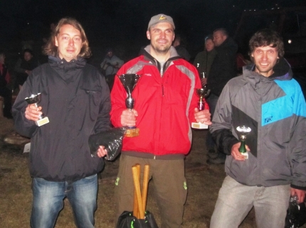 Stavbou finálové tratě byl pověřen Vojta Fuchs, kterému účast ve finále unikla doslova o dvacet centimetrů, z nichž nedokázal trefit cílový kolík a tak alespoň postavil finálové branky. Že Vojta při stavbě tratí není žádný troškař, se potvrdilo poměrně záhy. Branky číslo 7, 8 a 10 za soumraku byly hodně výživné. Po brance číslo sedm a osm, které byly nad síly Součka i Sedláčka, se vykrystalizovalo vedoucí kvarteto, a všichni se svorně seřadili před brankou číslo deset. U ní byl nejdříve Václav Serbus a ač měl několik dobrých příležitostí z přijatelných vzdáleností, netrefil. Podobně si vedli i ostatní, než přijel k brance Zdeněk Schiffmann a s chladnou hlavou proměnil svoji dosud 100% účast na turnajích v první vytoužený triumf. Po mnoha druhých a třetích místech to bylo sladké vítězství a zasloužená Free croquetová sada. Druhé místo obsadil Jakub Lošek, jenž se později u ohně přiznal, že kroketovou palici držel v ruce ten den vůbec poprvé. Takže až příště na turnaji narazíte na sympaťáka s kapucí, nemusí to být nutně Vocťour, a rozhodně se před ním mějte na pozoru! Třetí se dotknul cílového kolíku všemi mastmi mazaný Michal Zikmund a nepopulární brambora zbyla na Vaška Serbuse. Všem děkujeme za účast a těšíme se 21.5. ve Stromovce na viděnou.