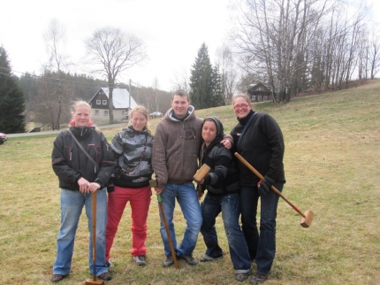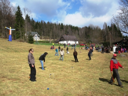 Zdravíme všechny krokeťačky a krokeťáky v nové sezoně. Vůbec poprvé se „áčkový“ turnaj konal mimo území středočeského kraje a to v Albrechticích v Jizerských horách, kde se zaměstnanci firmy Pomi stylově loučili se zimní sezonou na sjezdovce U kapličky. Jak známo, v Albrechticích se kroket mastí o sto šest, a tak účast 44 hráčů a hráček v hlavním turnaji, až tak nepřekvapila. Potěšující bylo, že si turnaj nenechali ujít ani ostřílení borci a pravidelní účastnící Free croquetové tour. Výjimkou byl Vít Martinec, který svědomitě léčí zraněné koleno a těžce pracující Jan Novotný. S počasím jsme opět měli nehoráznou kliku a kromě občasného větříku, panovaly ideální podmínky.